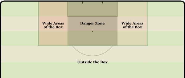 - Outside the box wide: generally low conversion zone, often from hopeful attempts after stalled attacks